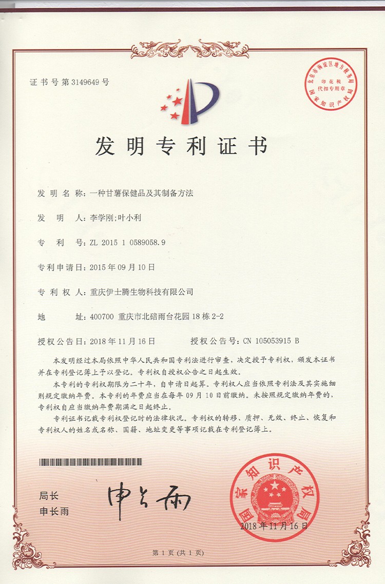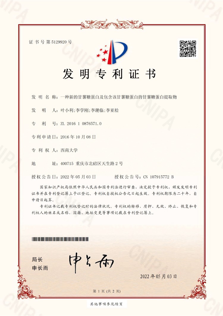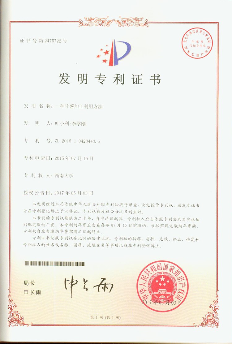 甘薯研究专利证书